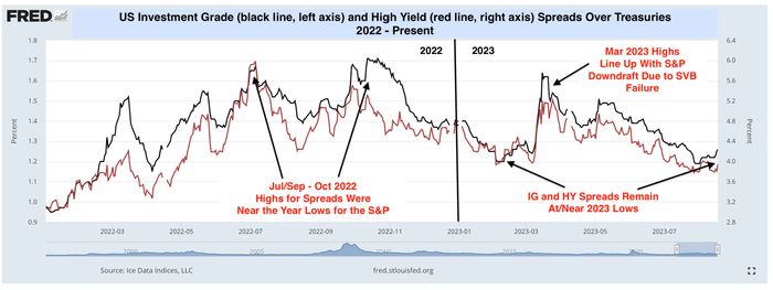 另一个令人惊讶的情况是:美国国债收益率与公司债券收益率之差仍然非常低,这与10月份股市跌至52周低点时以及3月份硅谷银行(Silicon Valley Bank)倒闭后的动荡有所不同。