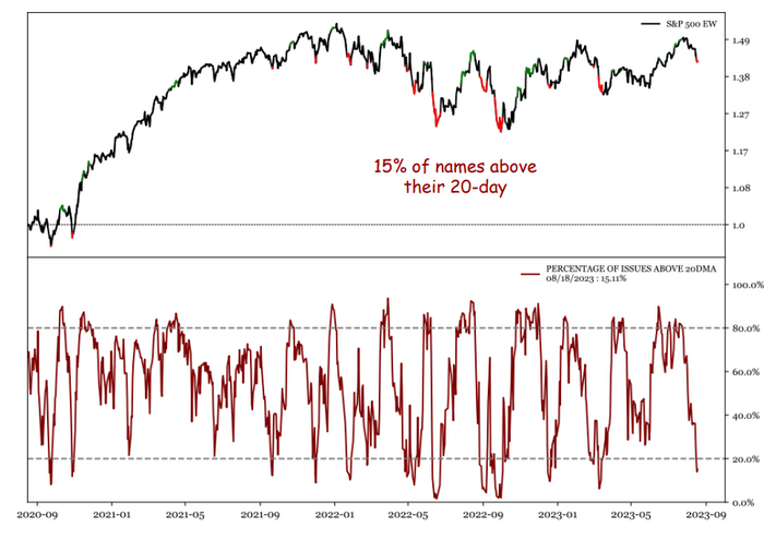 例如,根据BTIG的乔纳森•克林斯基和Renaissance Macro的杰弗瑞•德格拉夫的说法,截至上周五收盘,标准普尔500指数中只有15%的股票交易价格高于20日移动均线。下面是团队提供的图表: