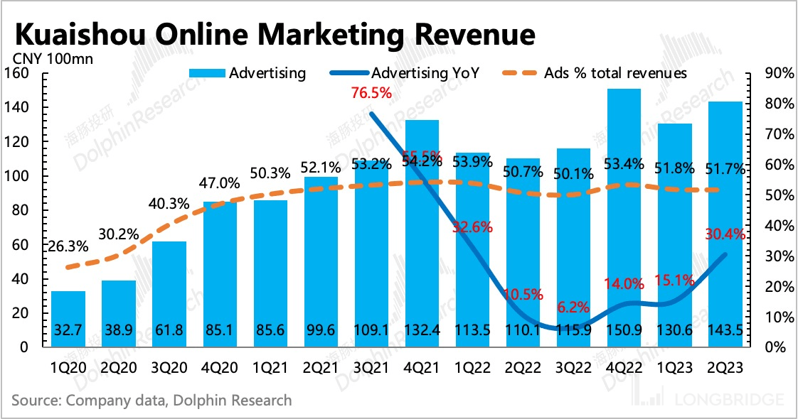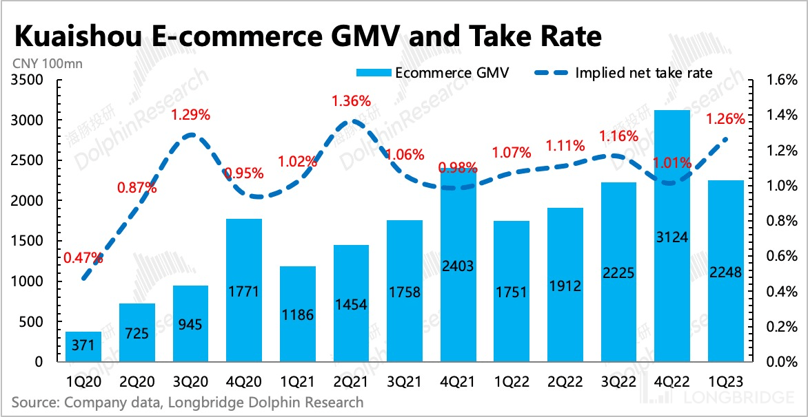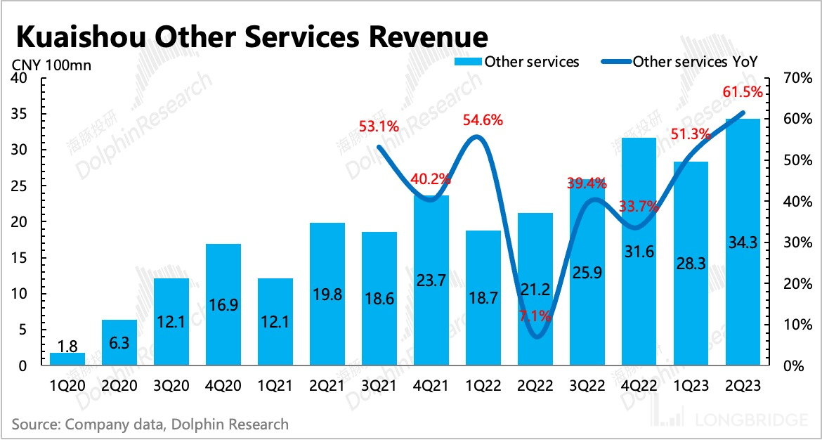 二季度快手电商 GMV 同比增速达到了 39%,单季实现 2655 亿元,而去年同期的基数并不低。因此 take rate 稍微提高了一点,佣金收入就因为乘数效应同比被爆拉 60%。