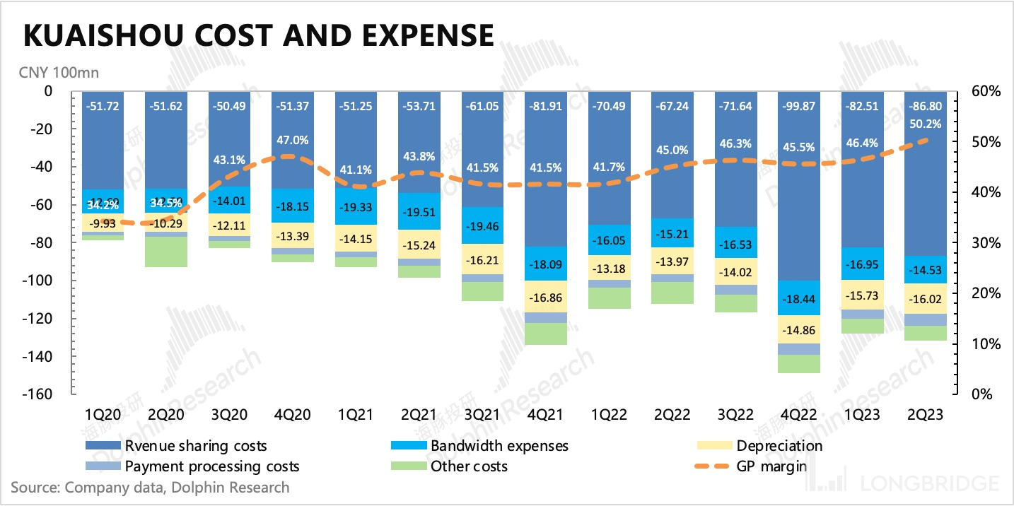 但二季度多支出的 5 亿与收入增加的 25 亿对比,公司显然是在刻意控费,尤其是以往与用户 MAU 同步增长的推广费用,环比并没有增加。因此,最终形成 20 亿主业经营利润净增加,毛利率达到 50%,环比提升 5pct。