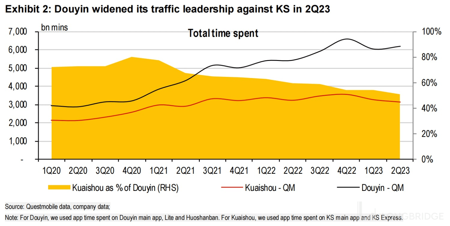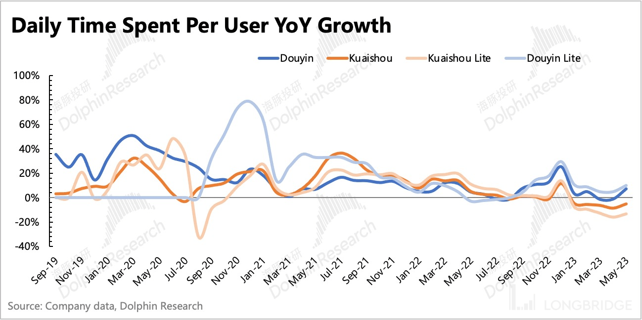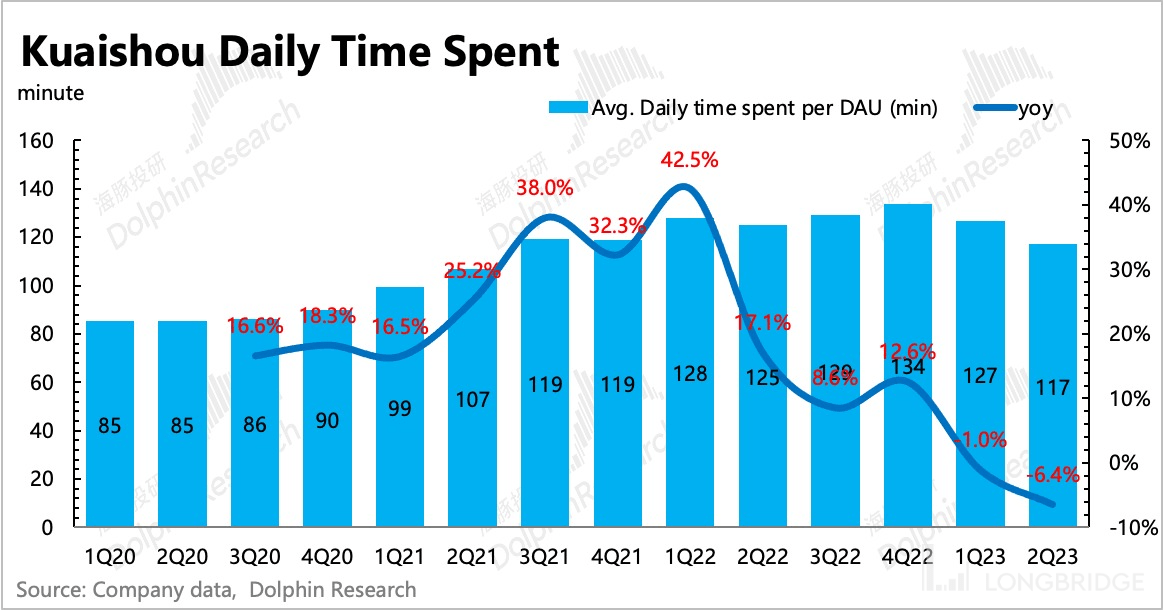 而同行(抖音)则反之继续增加,因此带动整体用户时长扩张速度高于快手,而快手二季度日均用户时长增速继续回落,同比已经基本持平。