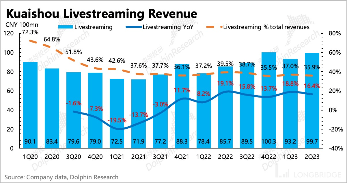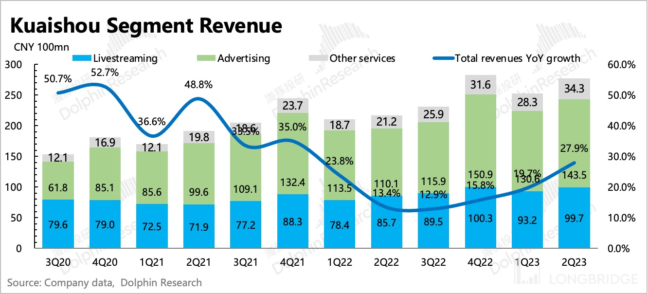 4、下半年压力大:直播打赏。二季度直播收入在高基数下仍然实现了 16% 的同比增长,得益于快手年初以来加大对头部公会的引进。