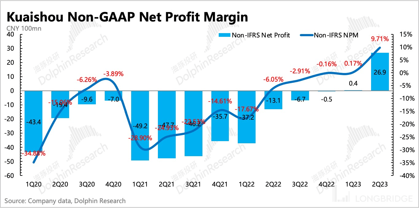 说了好几个季度快手 “盈利”,二季度才是真正意义上的盈利,实现 GAAP 下净利润 14.8 亿,而上个季度还是亏损 8 亿多。Non-GAAP 下净利润 27 亿,利润率已经接近 10%。