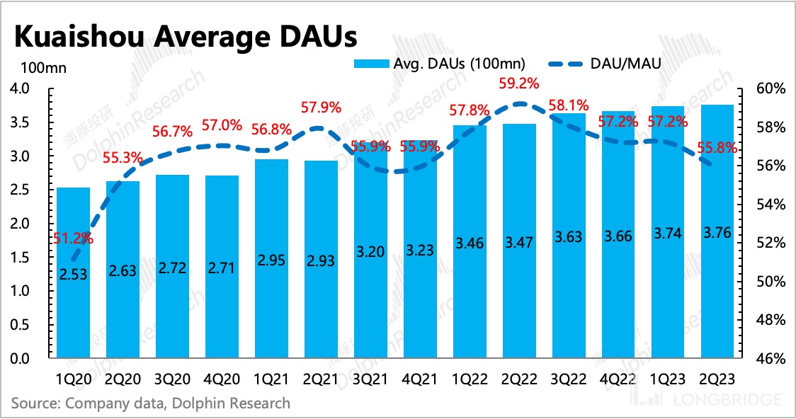 但从日均用户时长的横向对比来看,快手 Q2 的用户增量多半为新用户,粘性明显要比原用户要弱一些,因此虽然快手和快手极速版的 MAU 增速更快,但拉低了 “日均用户时长” 和 “DAU/MAU”,分别环比回落至 117 分钟/天(减少 9.6 分钟)和 55.8%(下降 1.4pct)。