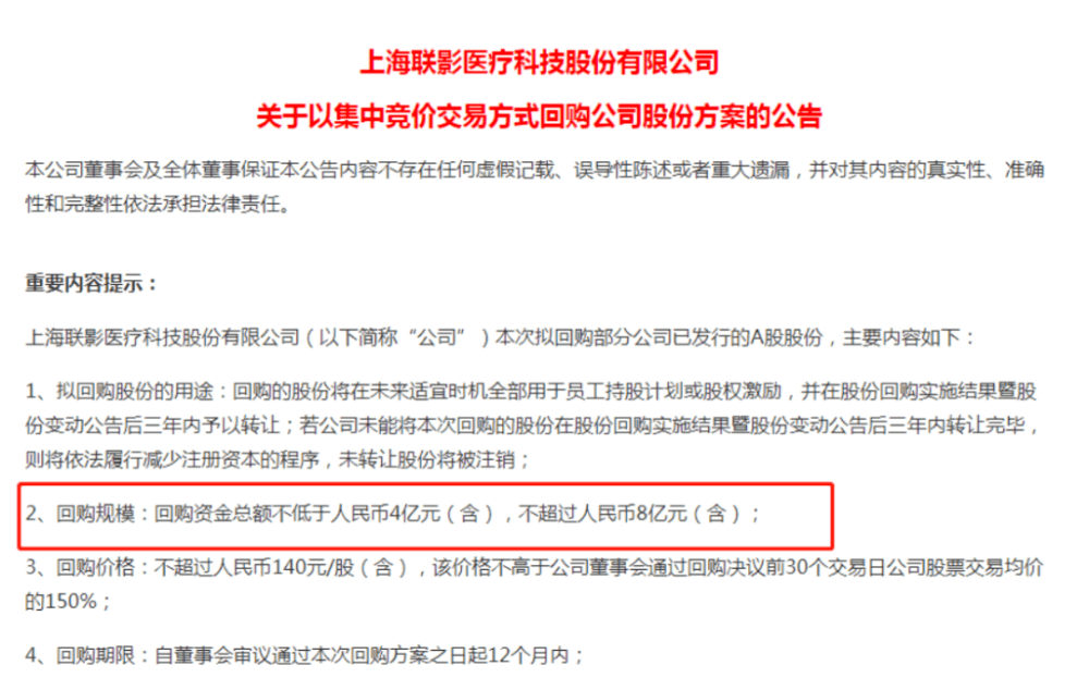 根据回购方案,联影医疗拟回购资金总额不低于4亿元不超过8亿元,回购价格不超过人民币140元/股,回购的股份将在未来适宜时机全部用于员工持股计划或股权激励。截至8月22日收盘,联影医疗每股报109元,最新市值898亿元。
