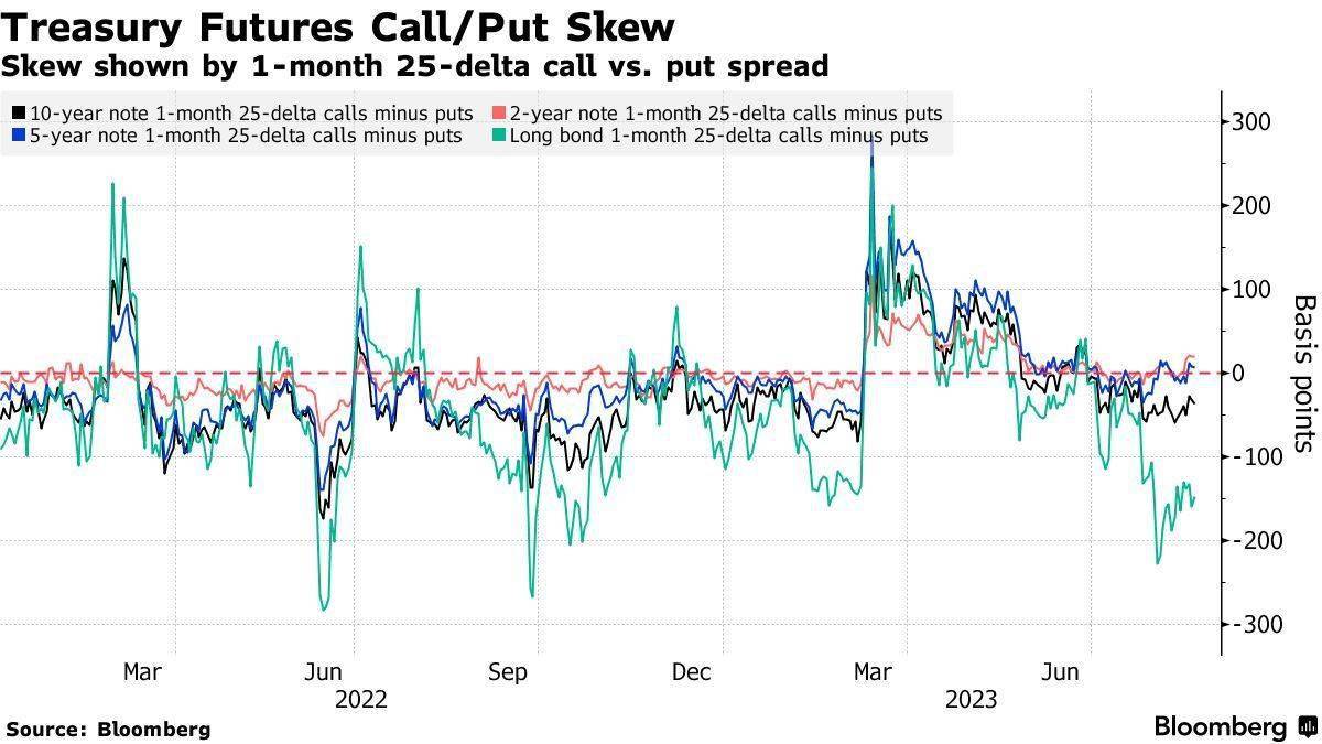 过去几周,随着交易员缩减对明年降息的预期,与SOFR挂钩的12个月期债Dec23/Dec24价差大幅收窄。SOFR期权中也出现了类似的情绪,交易员们瞄准明年及以后的下行趋势保护,与此同时他们建立的看涨头寸将因更多的降息押注被挤出市场而获利。