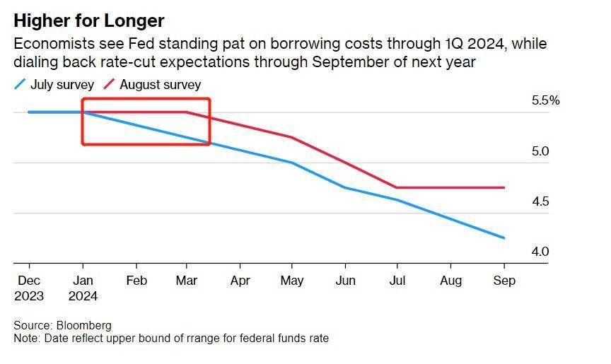 如今市场普遍预计美联储加息周期完结,但是对“Higher for longer”的担忧情绪升温——预计高利率将至少持续至明年3月。一项最新的媒体调查显示,经济学家们支持美联储将在更长时间内维持高利率(higher for longer)的预期,接受调查的经济学家目前预计,美联储将在更长时间内维持高利率,因为经济走强可能会使通胀持续高于美联储的目标。虽然经济学家认为近期美联储不会进一步加息,但他们也预计美联储至少在明年第二季度之前不会降息,而这一预期比7月份的预测晚了足足三个月。
