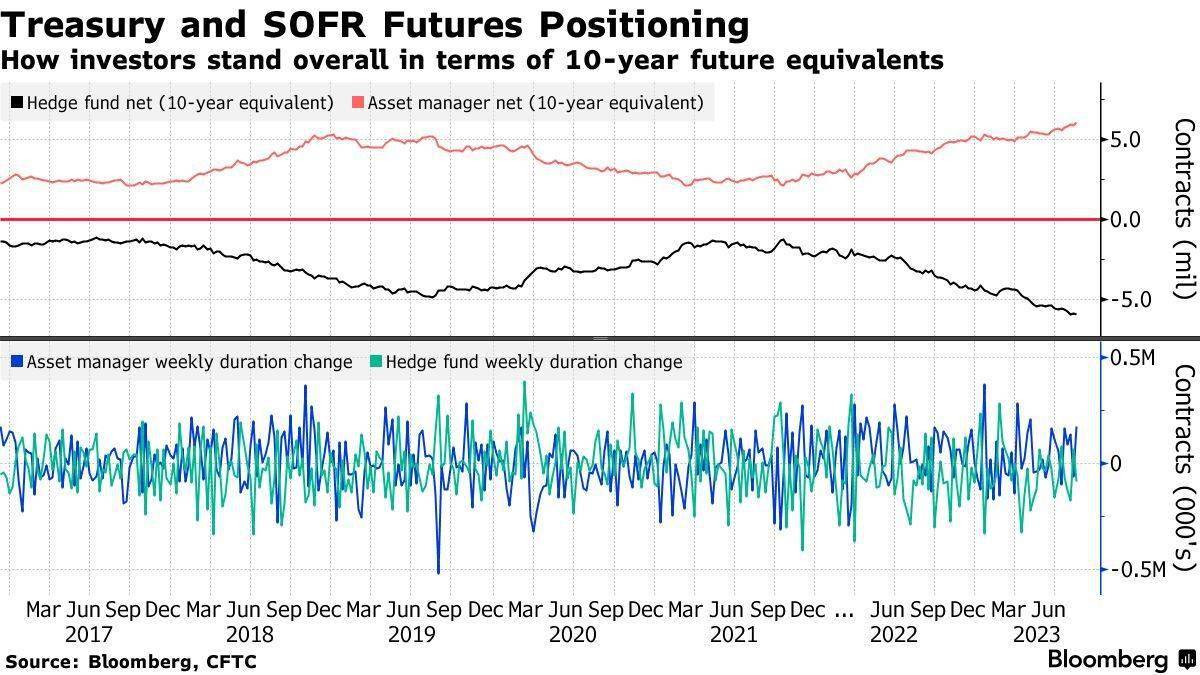 美国商品期货交易委员会(CFTC)截至8月15日的数据显示,资产管理公司增加了SOFR期货的净空头头寸,而对冲基金则增加了净多头头寸。进一步看,随着收益率不断走高,资产管理公司增加净长期存续期,而对冲基金看跌,表明押注未来的美债抛售浪潮还有更大空间。