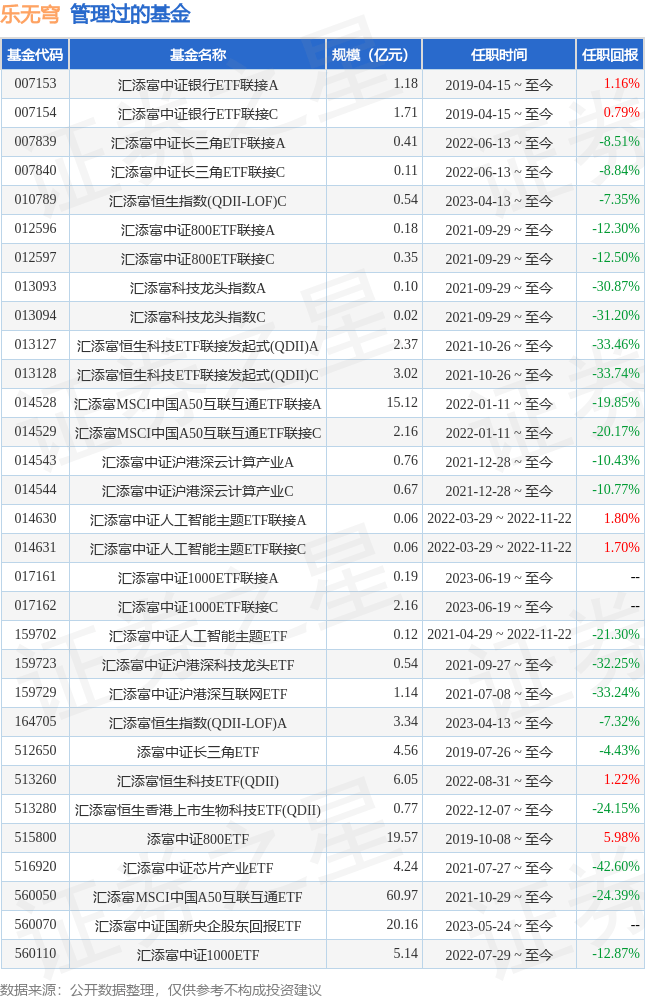 乐无穹女士:中国国籍,复旦大学经济学硕士。2014年7月加入汇添富基金管理股份有限公司,历任金融工程助理分析师、指数与量化投资部分析师。2019年4月15日至今任中证银行交易型开放式指数证券投资基金联接基金的基金经理。2019年7月26日至今任中证长三角一体化发展主题交易型开放式指数证券投资基金的基金经理。2019年10月8日至今任中证800交易型开放式指数证券投资基金的基金经理。2021年4月29日至2022年11月21日任汇添富中证人工智能主题交易型开放式指数证券投资基金的基金经理。2021年7月8日至今任汇添富中证沪港深互联网交易型开放式指数证券投资基金的基金经理。2021年7月27日至今任汇添富中证芯片产业交易型开放式指数证券投资基金的基金经理。2021年9月27日至今任汇添富中证沪港深科技龙头交易型开放式指数证券投资基金的基金经理。2021年9月29日至今任汇添富中证800交易型开放式指数证券投资基金联接基金的基金经理。2021年9月29日至今任汇添富中证沪港深科技龙头指数型发起式证券投资基金的基金经理。2021年10月26日至2022年10月30日任汇添富恒生科技指数型发起式证券投资基金(QDII)的基金经理。2021年10月29日至今任汇添富MSCI中国A50互联互通交易型开放式指数证券投资基金的基金经理。2021年12月28日至今任汇添富中证沪港深云计算产业指数型发起式证券投资基金的基金经理。2022年1月11日至今任汇添富MSCI中国A50互联互通交易型开放式指数证券投资基金联接基金的基金经理。2022年3月29日至2022年11月21日任汇添富中证人工智能主题交易型开放式指数证券投资基金联接基金的基金经理。2022年6月13日至今任中证长三角一体化发展主题交易型开放式指数证券投资基金联接基金的基金经理。2022年7月29日至今任汇添富中证1000交易型开放式指数证券投资基金的基金经理。2022年8月31日至今任汇添富恒生科技交易型开放式指数证券投资基金(QDII)的基金经理。2022年10月31日至今任汇添富恒生科技交易型开放式指数证券投资基金发起式联接基金(QDII)的基金经理。2022年12月7日至今任汇添富恒生香港上市生物科技交易型开放式指数证券投资基金(QDII)的基金经理。2023年4月13日至今任汇添富恒生指数型证券投资基金(QDIILOF)的基金经理。