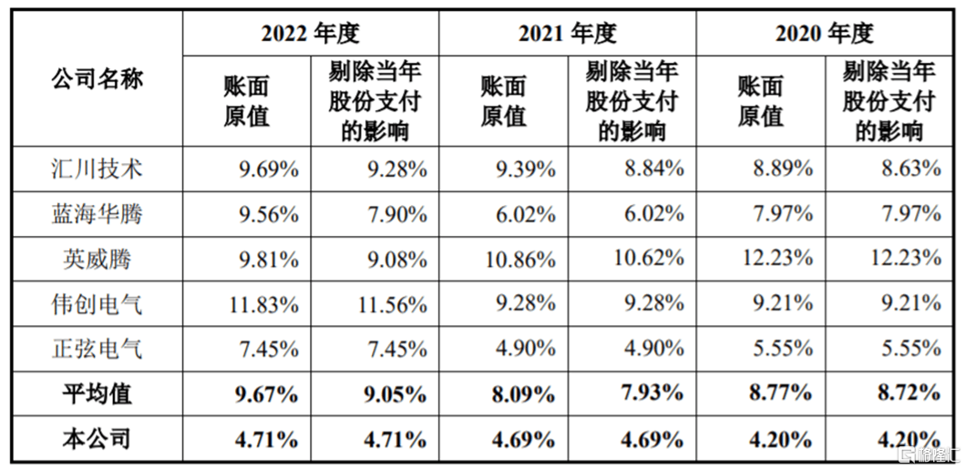 我国变频器和伺服系统的生产工艺发展迅速,随着生产技术不断更新,下游客户对公司产品的性能、工艺和质量提出更高的要求。2020年至2022年,公司的研发费用分别为2630.24万元、2911.05万元和2522.49万元,占营业收入的比重分别为4.20%、4.69%和4.71%,公司研发费用率明显低于同行业可比公司平均值。