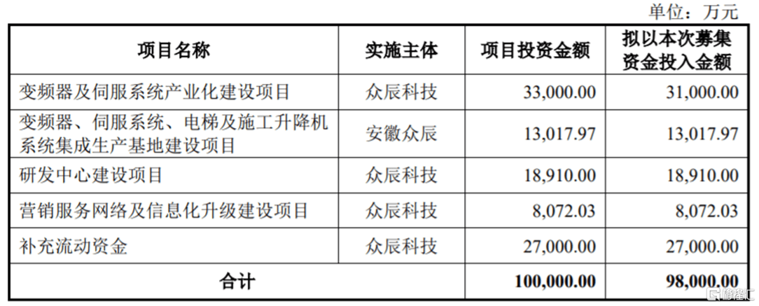 本次IPO所募集资金主要用于变频器及伺服系统产业化建设项目、变频器、伺服系统、电梯及施工升降机系统集成生产基地建设项目、研发中心建设项目、营销服务网络及信息化升级建设项目、补充流动资金。