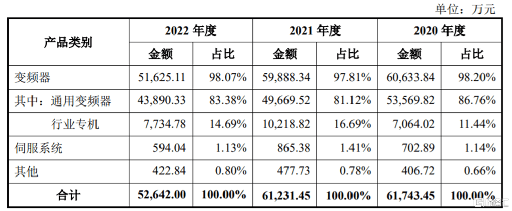 具体来看,报告期内,众辰科技的主营业务收入主要来源于变频器和伺服系统。其中变频器的营收占比在90%以上,是公司的重要收入来源。