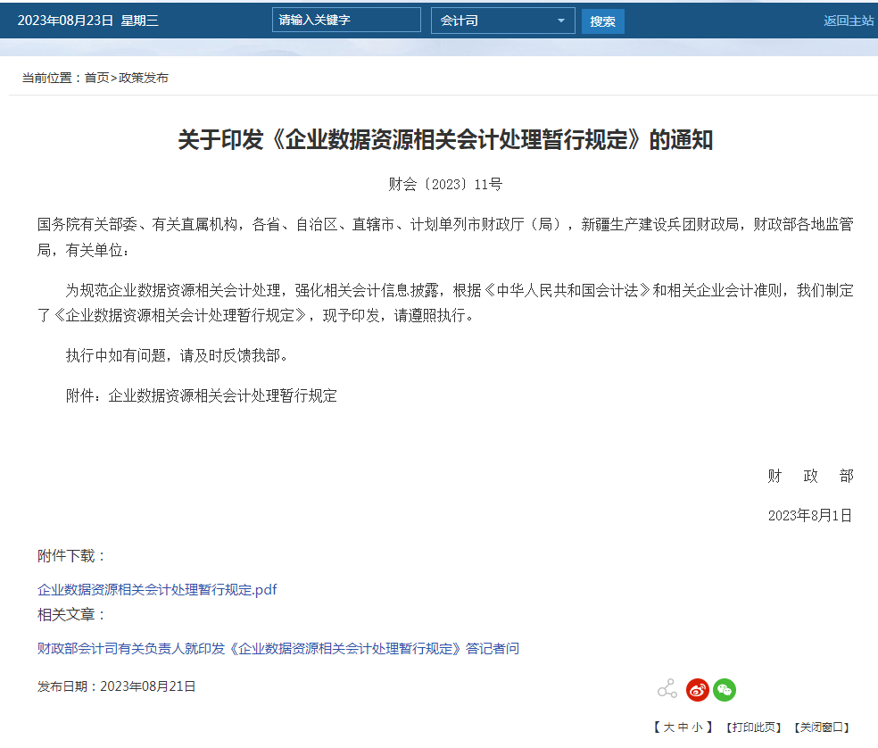 另据财政部官网消息,财政部于8月21日正式对外发布《企业数据资源相关会计处理暂行规定》,该规定对数据资源的确认范围和会计处理适用准则等作出规定,将于2024年1月1日起施行。《暂行规定》指出,企业使用的数据资源,符合相关条件的,应当确认为无形资产;企业日常活动中持有、最终目的用于出售的数据资源,符合相关条件的,应当确认为存货。