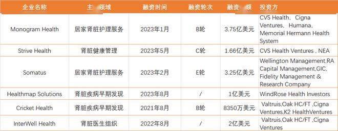 多家关注慢性肾病的企业获得大额融资。肾脏科技企业Monogram Health拿下3.75亿美元融资,肾脏疾病护理企业SomatusE轮融资3.25亿美元,估值超过25亿美元。