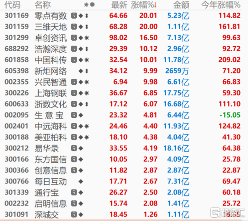 零点有数20CM涨停,中国科传、三维天地、新炬网络等多股涨停,卓创资讯、上海钢联等跟涨。