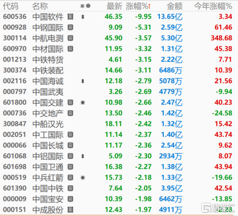 中国软件跳水跌停,中钢国际、中航电测、中铁装配、中国交建、中材国际等跌幅居前。