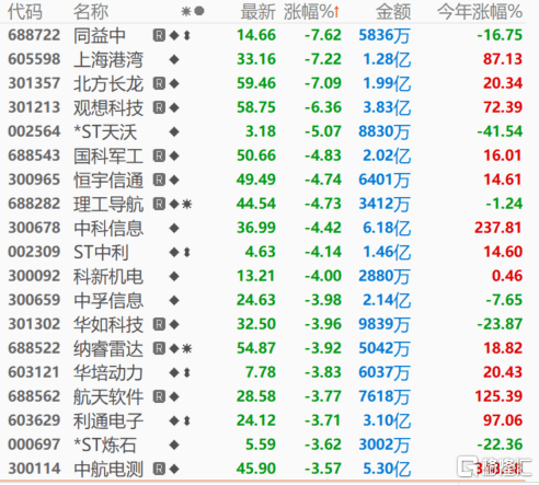 北方长龙、同益中跌超7%,国科军工、航天软件、观想科技、国科军工、华如科技等跟跌。