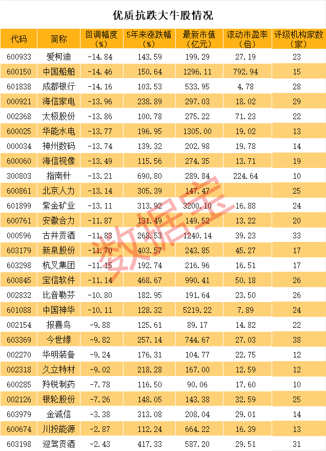 像中国神华这样的优质抗跌大牛股并不多。数据宝统计,过去5年股价大涨超100%且最新价较近5年高点回调不足15%的个股中,只有27只个股评级机构数在10家以上。具体来看,中国神华、紫金矿业、华能水电、中国船舶、古井贡酒等千亿市值股票进入榜单;另外还有羚锐制药、报喜鸟等市值不足百亿的个股在列。