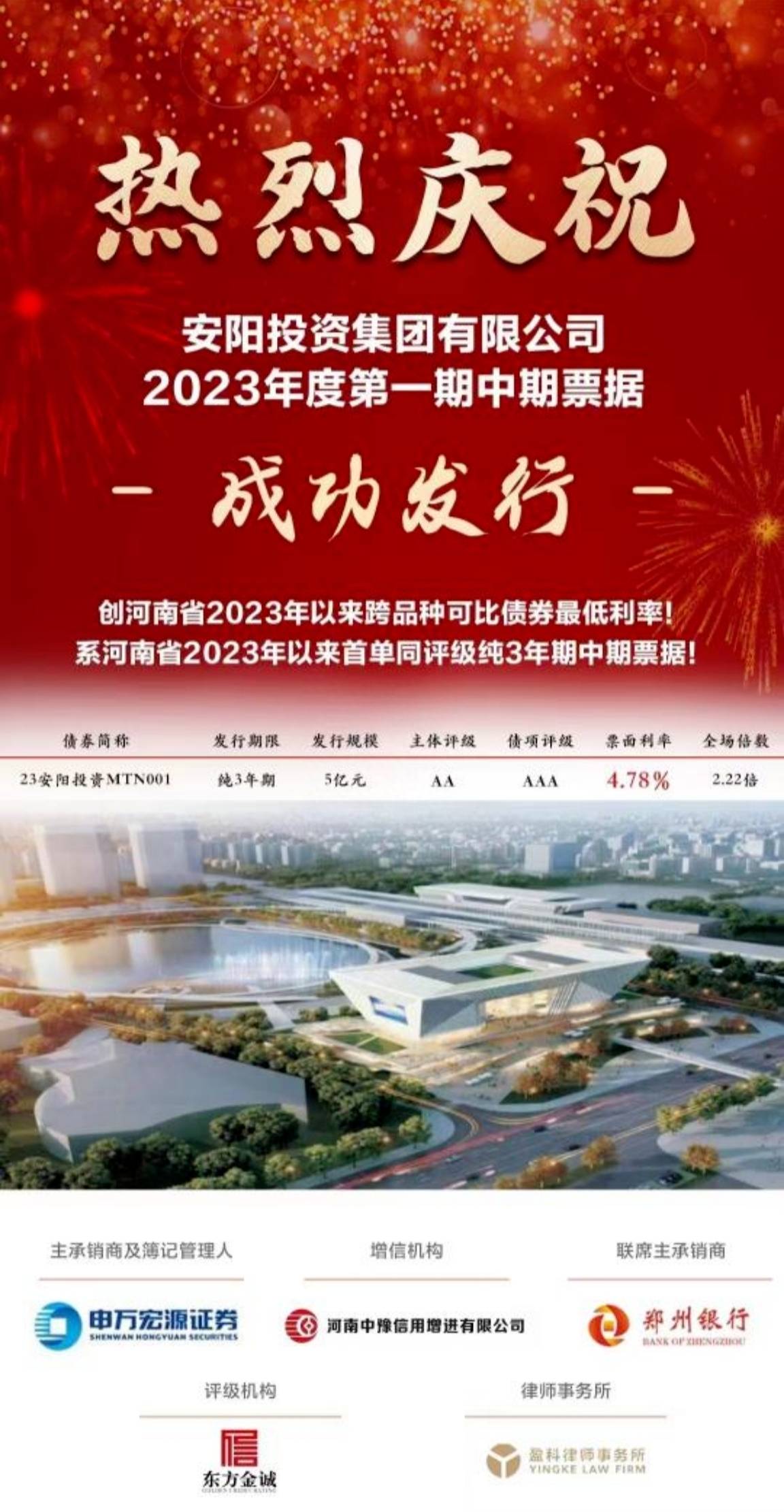 8月18日,由河南中豫信用增进有限公司(以下简称“中豫信增”)提供增信的安阳投资集团有限公司(以下简称“安阳投资集团”)2023年度第一期中期票据纯市场化发行成功。本期债券发行规模5亿元,期限纯3年,全场认购倍数2.22倍,发行票面4.78%,系我省2023年以来首单同评级纯3年期中期票据,并创全省今年以来跨品种可比债券最低利率。
