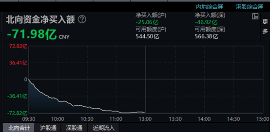 北向资金上午再度呈现净卖出,半天净卖出额约72亿元。
