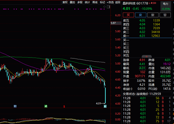 股价大幅波动的个股方面,晶科科技今天上午股价盘中触及跌停。