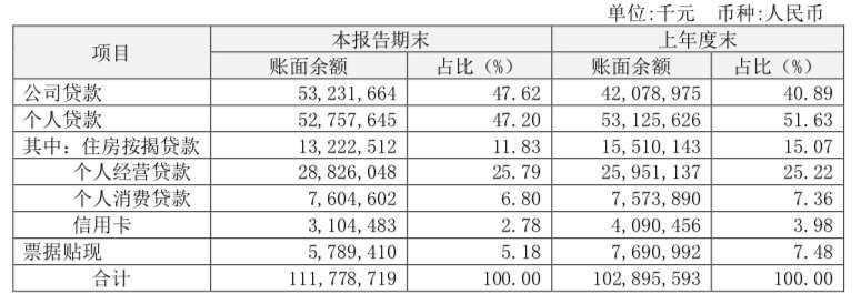 截至报告期末,瑞丰银行贷款总额1117.78亿元,较上年末增加88.83亿元。其中,公司贷款532.32亿元,占比47.62%,较上年末增加111.53亿元;个人贷款527.58亿元,占比47.20%,较上年末下降3.68亿元。