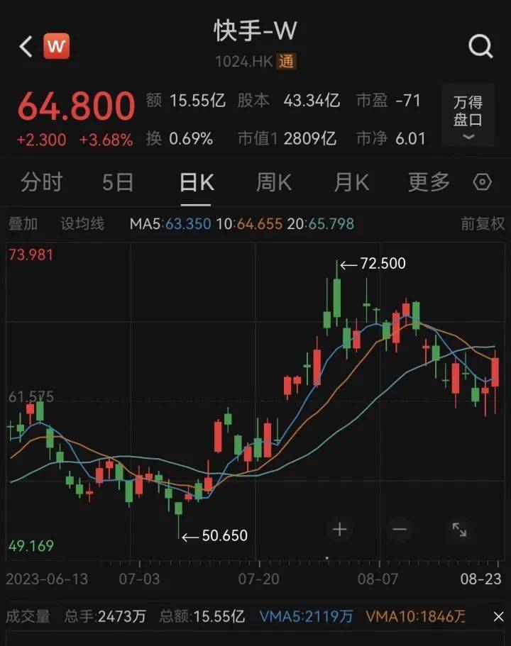 截至发稿前,快手港股每股报64.8港元,涨幅3.68%。