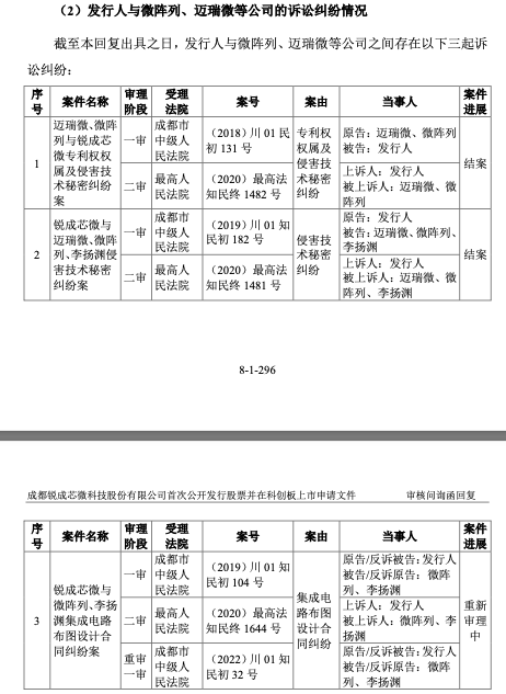 在问询回复的“诉讼”一节中,上交所要求锐成芯微全面梳理与微阵列、迈瑞微等公司的合作历史、诉讼纠纷情况,逐一列示案件受理情况、基本案情、诉讼请求、判决结果及执行情况,诉讼事项对发行人的影响等。