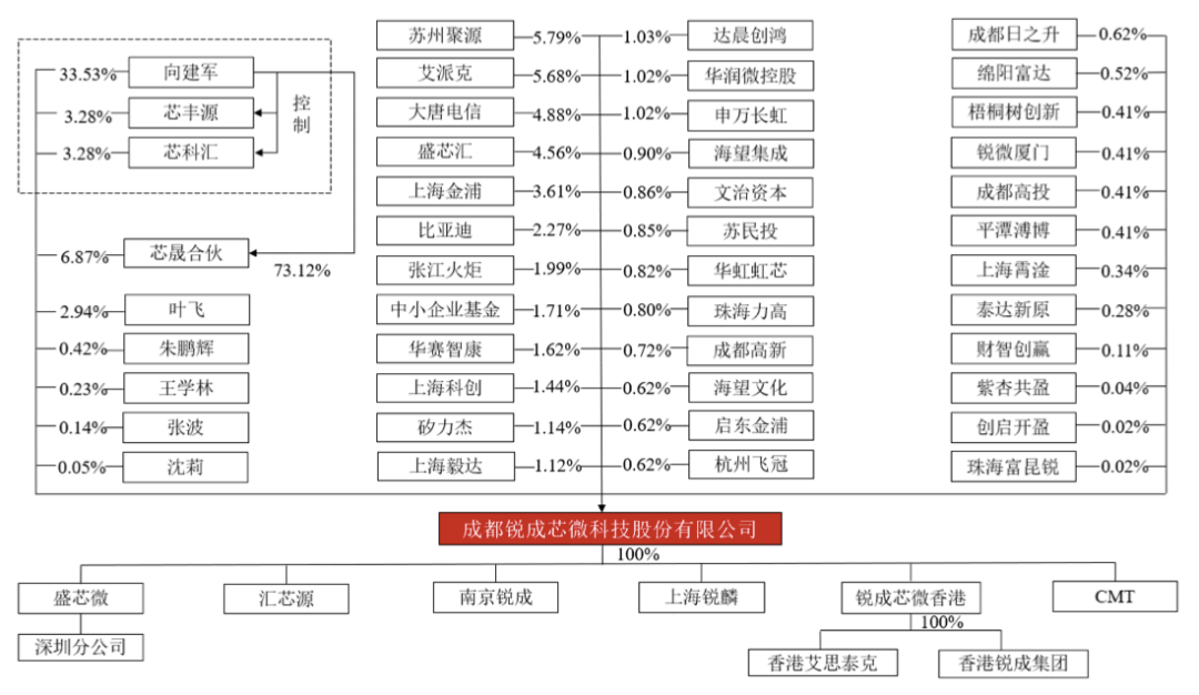 招股书显示,向建军直接持有锐成芯微33.53%股份,同时作为芯丰源、芯科汇普通合伙人及芯晟合伙的有限合伙人间接持股0.34%、0.94%、5.02%,合计控制公司40.09%的股份表决权,为实际控制人。