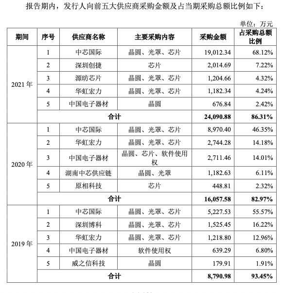 报告期内,锐成芯微向前五大供应商合计采购金额占当期采购总额的比例为93.45%、82.97%、 86.31%。其中,向中芯国际采购金额占当期采购总额的比例为55.57%、46.35%、 68.12%,集中度较高。