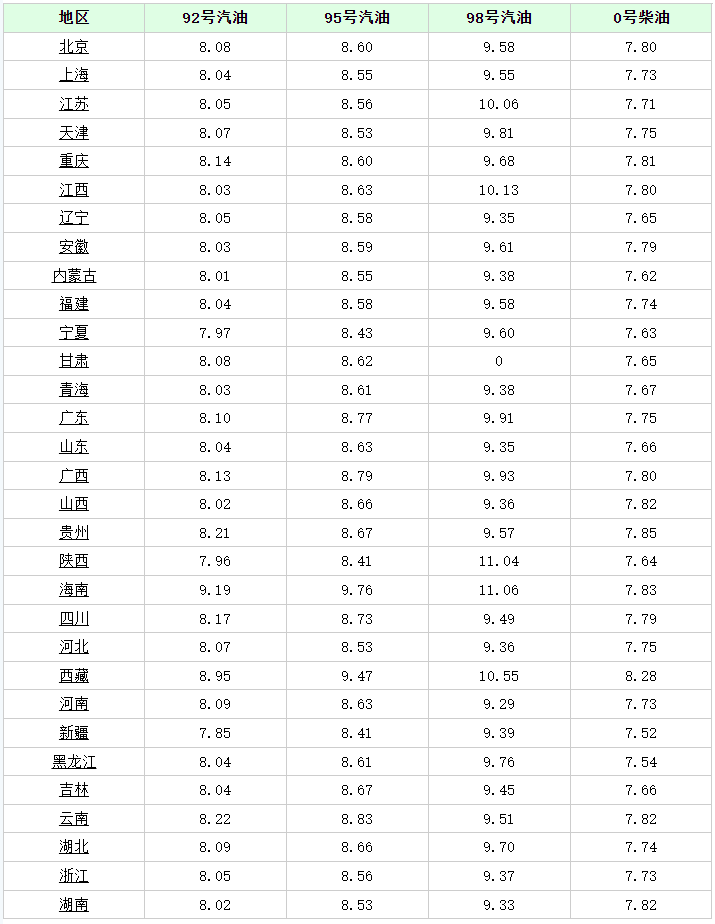 下面小编带大家看看全国各地加油站上涨后的92汽油、95汽油及柴油最新油价
