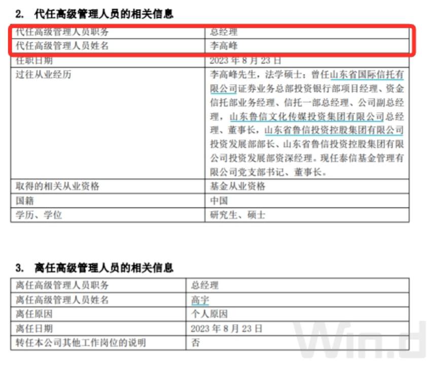 今日,泰信基金发布公告称,高宇于2023 年 8 月 23 日因个人原因离任基金管理公司总经理一职,同时,宣布由李高峰代任基金管理公司总经理。