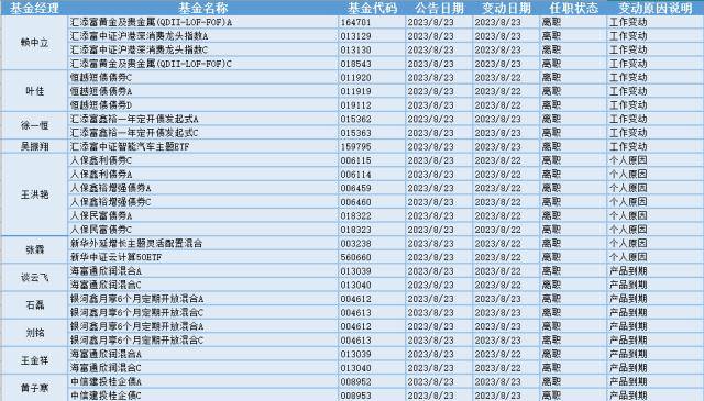 根据巨灵统计的数据显示,近30天(7.24-8.23)共有412只基金产品的基金经理发生离职变动,其中今天(8.23)有28只基金产品发布基金经理离职公告,从变动原因上来看,有4位基金经理是由于工作变动而从管理的10只基金产品中离职,有2位基金经理是由于个人原因而从管理的8只基金产品中离职,另外还有10只基金产品到期导致5位基金经理发生变动。