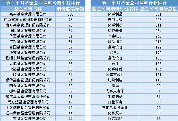近一个月(7月23日-8月23日),嘉实基金参与公司调研的数量最多,共调研110家上市公司,然后调研较为活跃的还有汇添富基金、南方基金和博时基金,分别调研75家、70家、64家上市公司;从调研行业上来看,基金公司对化学制品行业的上市公司调研次数最多,共有641次,其次是专用设备行业,基金公司调研了336次。