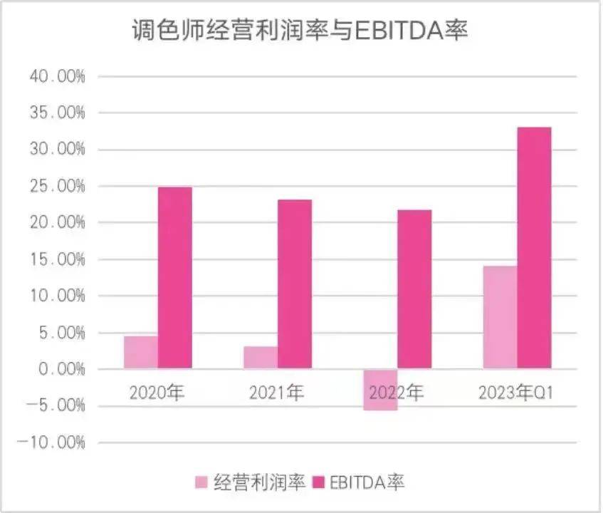 2023年第一季度也交出了调整后的首份成绩单,调色师在门店数减少的背景下,营收反而从2022年同期1.73亿元大幅提升至2.36亿元,EBITDA率达33.1%,经营利润率也从2022年同期的-2.2%提升为14.2%,并取得3350万元的经营利润,调色师也正式实现整体盈利。