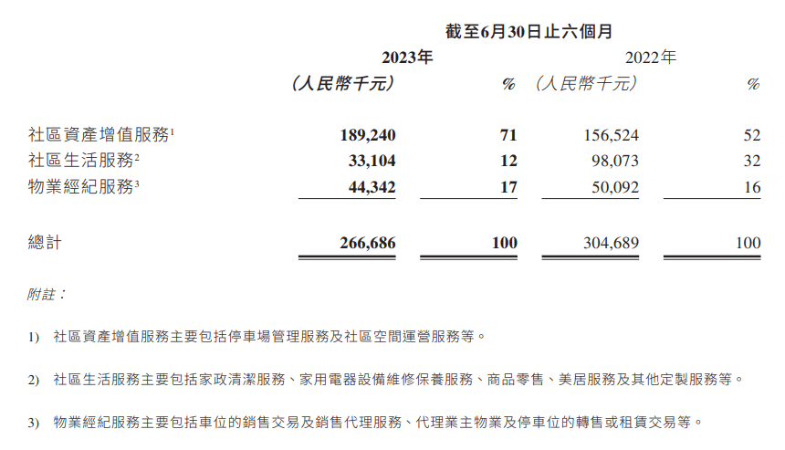 社区增值服务方面,则是受整体经济形势和房地产市场影响,物业经纪服务收入、毛利均有所下降;此外,家政清洁服务、家电维修保养服务、美居服务等社区生活服务,收入也在下滑,导致社区增值服务上半年收入2.67亿元,较去年同期下降约12%。