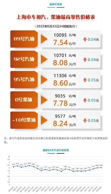 @上海发展改革刚刚发布本市油价调整的通知:8月24日零时起,92号汽油将上调为8.08元/升,95号汽油上调为8.60元/升,0号柴油上调为7.78元/升。正在下班路上的小伙伴们,要不要顺道加个油?按一般家用汽车油箱50L容量估测,加满一箱92号汽油将多花费约2元。注:98号汽油为企业自主定价。