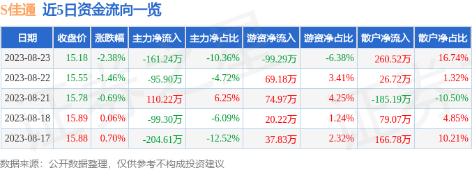 截至2023年8月23日收盘,S佳通(600182)报收于15.18元,下跌2.38%,换手率0.6%,成交量1.02万手,成交额1555.88万元。