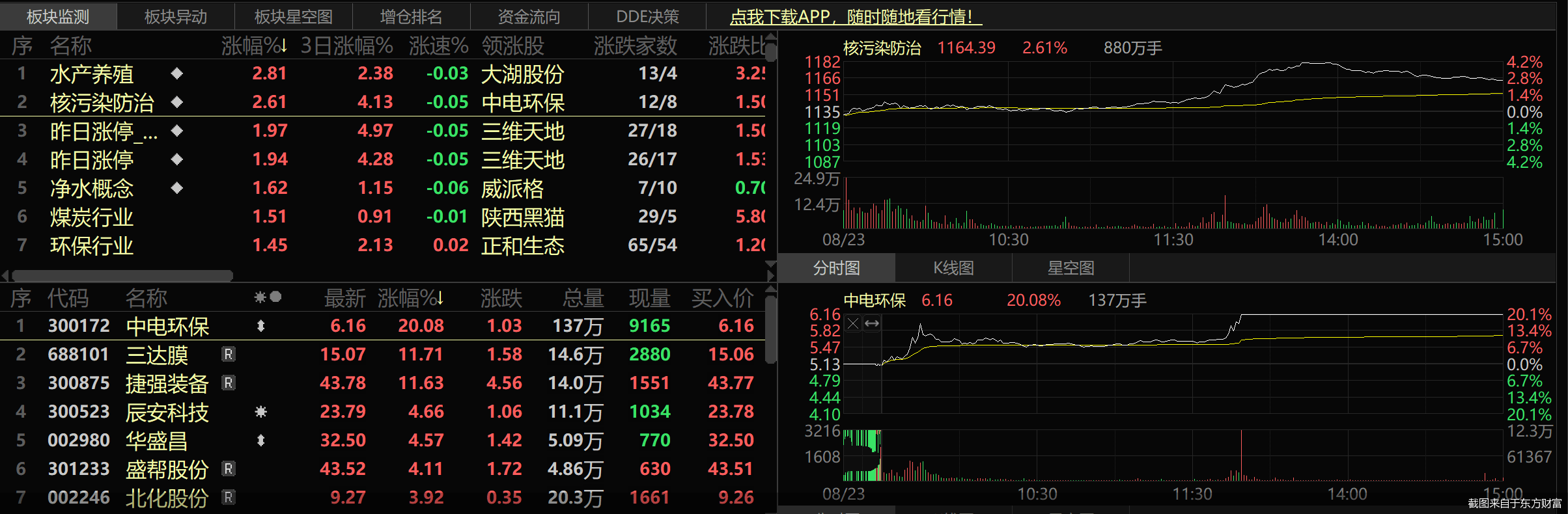 其中中电环保斩获“20CM”涨停。交易行情显示,8月23日,中电环保开盘跌0.58%,开盘价为5.1元/股,盘中中电环保股价不断拉升,下午开盘后冲上涨停,并持续保持涨停至收盘。截至8月23日收盘,中电环保报6.16元/股,涨幅为20.08%,总市值为41.69亿元,全天成交金额为7.81亿元,换手率为26.1%。