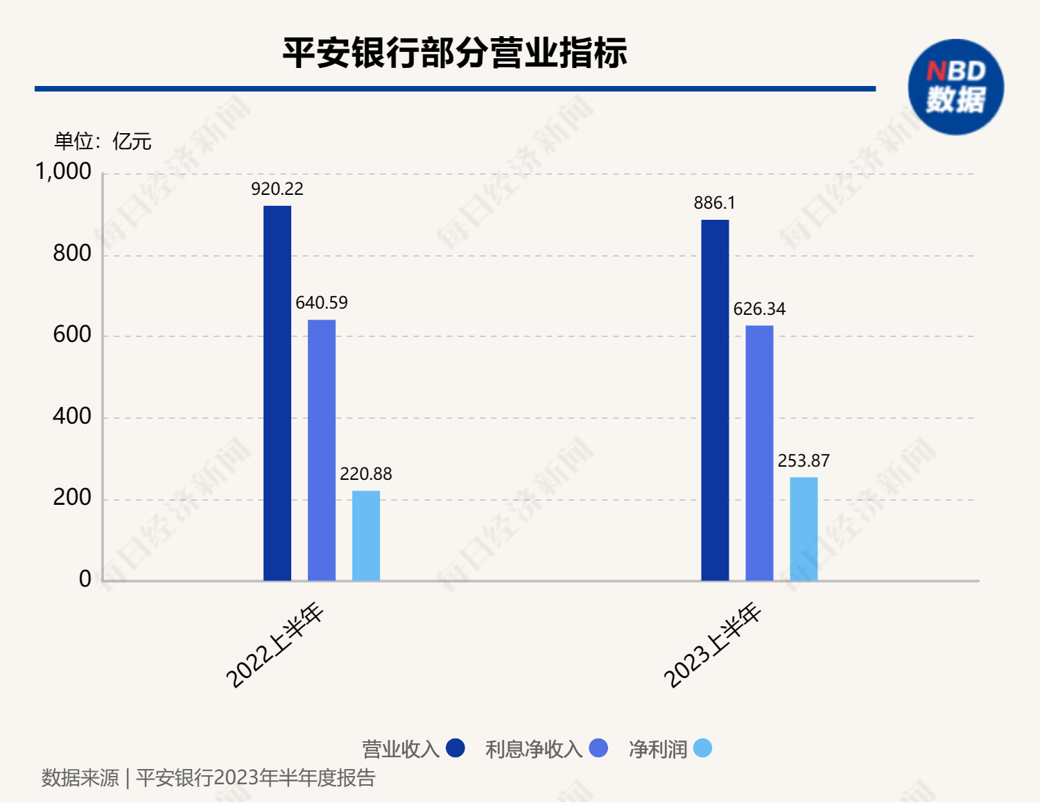 半年报显示,2023年上半年,平安银行实现营业收入886.10亿元,同比下降3.7%,主要受持续让利实体经济、市场波动等因素影响;其中利息净收入626.34亿元,同比下降2.2%;非利息净收入259.76亿元,同比下降7.1%。