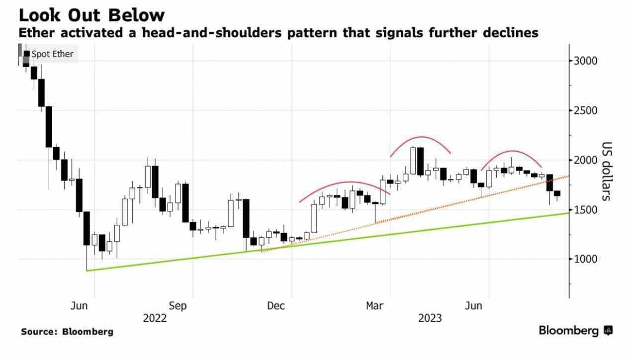 从技术面分析来看,以太坊形成了一个头肩顶的价格模式,则预示了进一步下跌的可能性,预测下跌目标价位为1100美元。截至发稿,该代币下跌1%,报1644美元。
