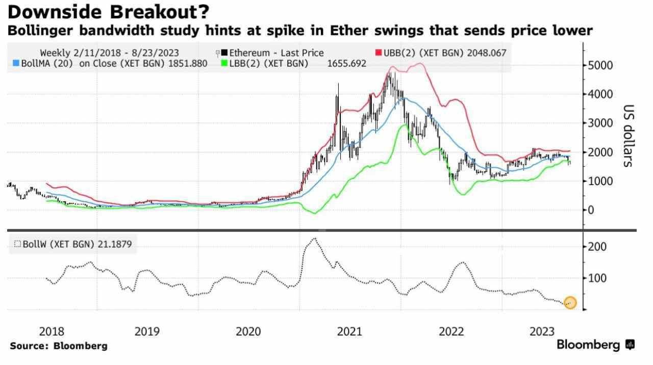 与此同时,以太坊的布林带宽接近2018年以来最窄范围。带宽指的是布林通道上轨和下轨之间的缝隙,这是一种衡量标的波动性的常见方法。技术分析师通常将缩窄的布林带宽视为资产波动加剧的前兆。目前,以太坊也突破了该通道下轨,即表明波动性的增加可能导致下跌。