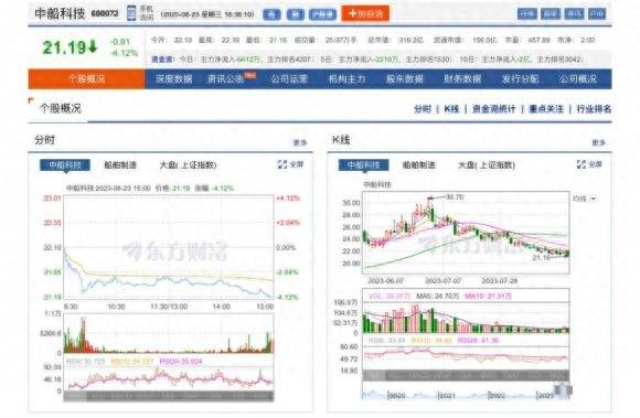 根据同花顺数据中心显示,截至8月23日收盘,中船科技高开低走,成交金额5.57亿元,当日收盘报21.19元。