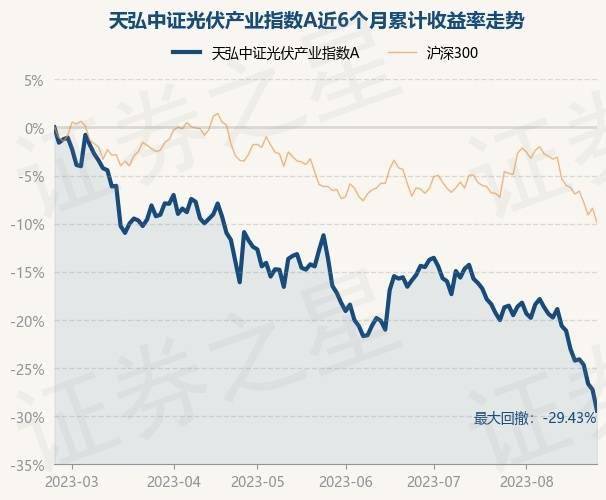 8月23日,天弘中证光伏产业指数A最新单位净值为0.8453元,累计净值为0.8453元,较前一交易日下跌3.0%。历史数据显示该基金近1个月下跌12.57%,近3个月下跌17.52%,近6个月下跌29.44%,近1年下跌43.12%。该基金近6个月的累计收益率走势如下图: