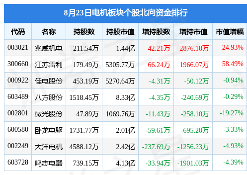 北向资金方面,当日电机板块北向资金持股市值为19.49亿元,增持440.8万元。其中增持最多的是兆威机电,增持了0.29亿元。减持持最多的是鸣志电器,减持了0.19亿元。电机板块北向资金持股变动明细见下表: