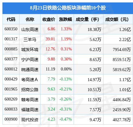 8月23日铁路公路板块较上一交易日下跌0.58%,中铁特货领跌。当日上证指数报收于3078.4,下跌1.34%。深证成指报收于10152.6,下跌2.14%。铁路公路板块个股涨跌见下表: