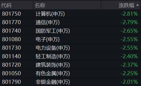 板块方面,申万一级行业分类下,两市跌幅超过2%的板块多达九个,分别为计算机、通信、国防军工、电子、电力设备、轻工制造、建筑装饰、有色金属、非银金融。同时,跌幅超过1%的板块多达25个,占比高达51%。