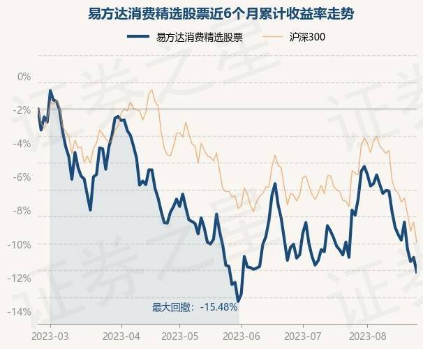 8月23日,易方达消费精选股票最新单位净值为0.8602元,累计净值为0.8602元,较前一交易日下跌1.21%。历史数据显示该基金近1个月下跌2.47%,近3个月下跌3.27%,近6个月下跌12.1%,近1年下跌7.42%。该基金近6个月的累计收益率走势如下图: