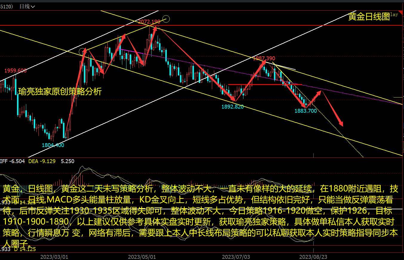黄金,日线图,黄金这二天未写策略分析,整体波动不大,一直未有像样的大的延续,在1880附近遇阻,技术面,日线,MACD多头能量柱放量,KD金叉向上,短线多占优势,但结构依旧完好,只能当做反弹震荡看待,后市反弹关注1930-1935区域得失即可,整体波动不大,今日策略1916-1920做空,保护1926,目标1910-1900-1890,以上建议仅供参考具体实盘实时更新,获取瑜亮独家策略,具体做单私信本人获取实时策略,行情瞬息万 变,网络有滞后,需要跟上本人中长线布局策略的可以私聊获取本人实时策略指导同步本人圈子。