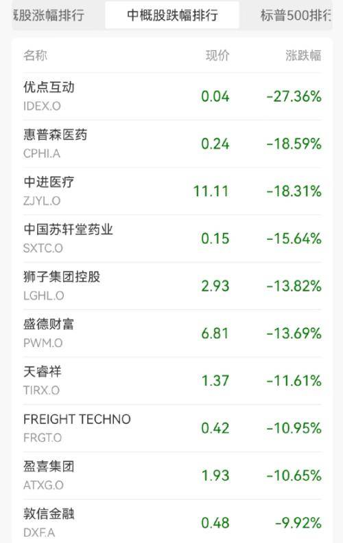 优点互动跌27.36%,惠普森医药跌18.59%,中进医疗跌18.31%,领跌中概股。知乎跌9.17%,叮咚买菜跌8.99%,雾芯科技跌5.23%。中概新能源汽车股涨跌不一,蔚来汽车涨0.56%,小鹏汽车涨0.75%,理想汽车跌0.49%。